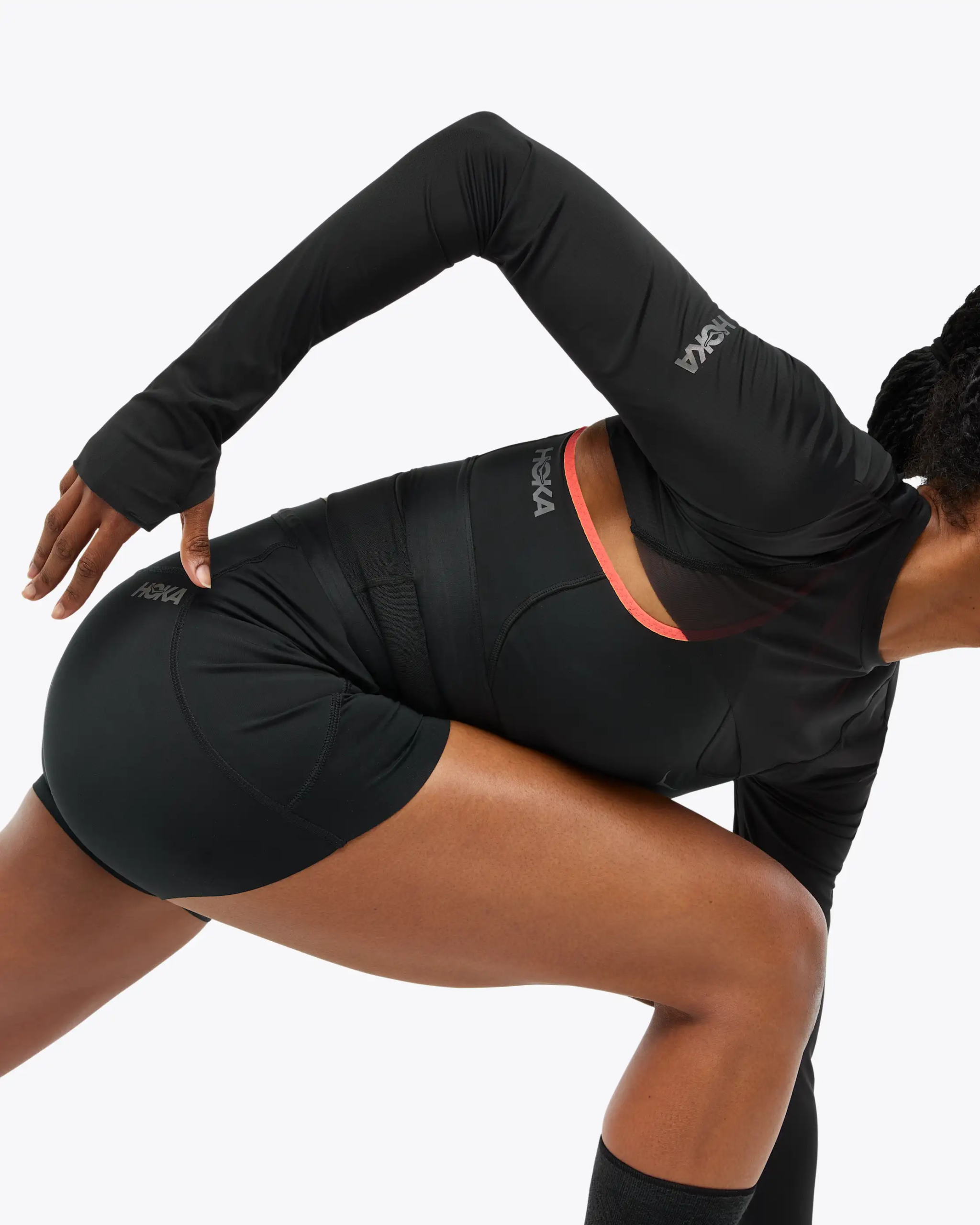 Designed to pair with the Race Day Bra, our Race Day Shrug provides extra warmth during brisk morning runs and additional coverage when the skies clear. Offering a touch more coverage for our modesty-minded runners along with rear drop pockets for stashing nutrition, our airy mesh material allows for maximal breathability and minimal weight.